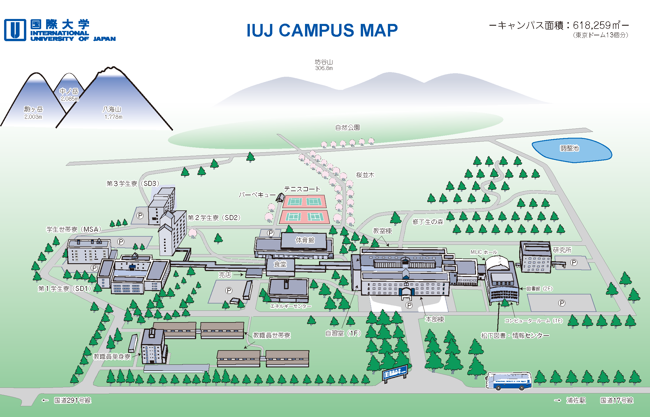 IUJ is located about 230 kilometers northwest of Tokyo. The nearest town is Urasa and it takes about 1 hour and 40 minutes to get to Urasa from Tokyo by the Joetsu-Shinkansen or Bullet train. The Joetsu-Shinkansen and the Kan’etsu Expressways provide easy access to Tokyo and Niigata City. Free shuttle-bus service connects IUJ with the town and the Urasa railway station.