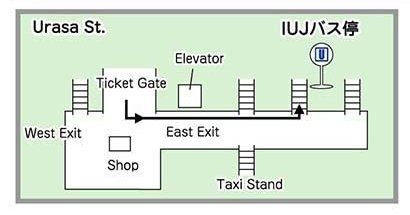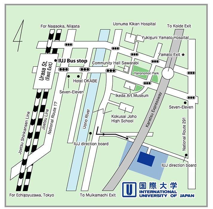 Take a Toki SuperExpress to “Urasa” station about 90 min. from Tokyo station, and 40 min. from Niigata station. IUJ is ten minutes from “Urasa” station (East Exit) by IUJ shuttle bus*. *Please turn left (East Exit) after the ticket gate (only one in the station). Go down the second stairwell to the left. You will find the IUJ bus stop. The IUJ shuttle bus is available from about 8 am to about 8 pm (once an hour) from Monday to Friday (Special schedule for Saturday and Sunday).