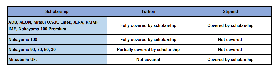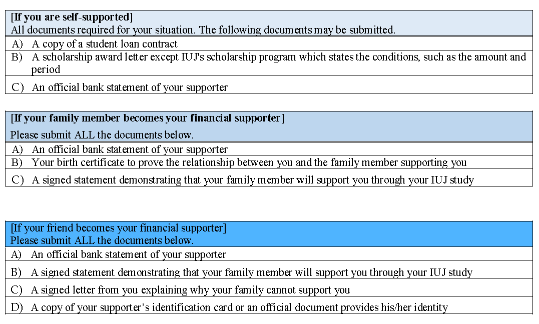 If you are self-sponsored or awarded/nominated for a scholarship that does not cover a monthly stipend, you must prove that you have sufficient funds to cover the expenses during your stay at IUJ. Please check the table to know what documents you need to submit.