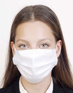 A mask covers the lower half of her face
