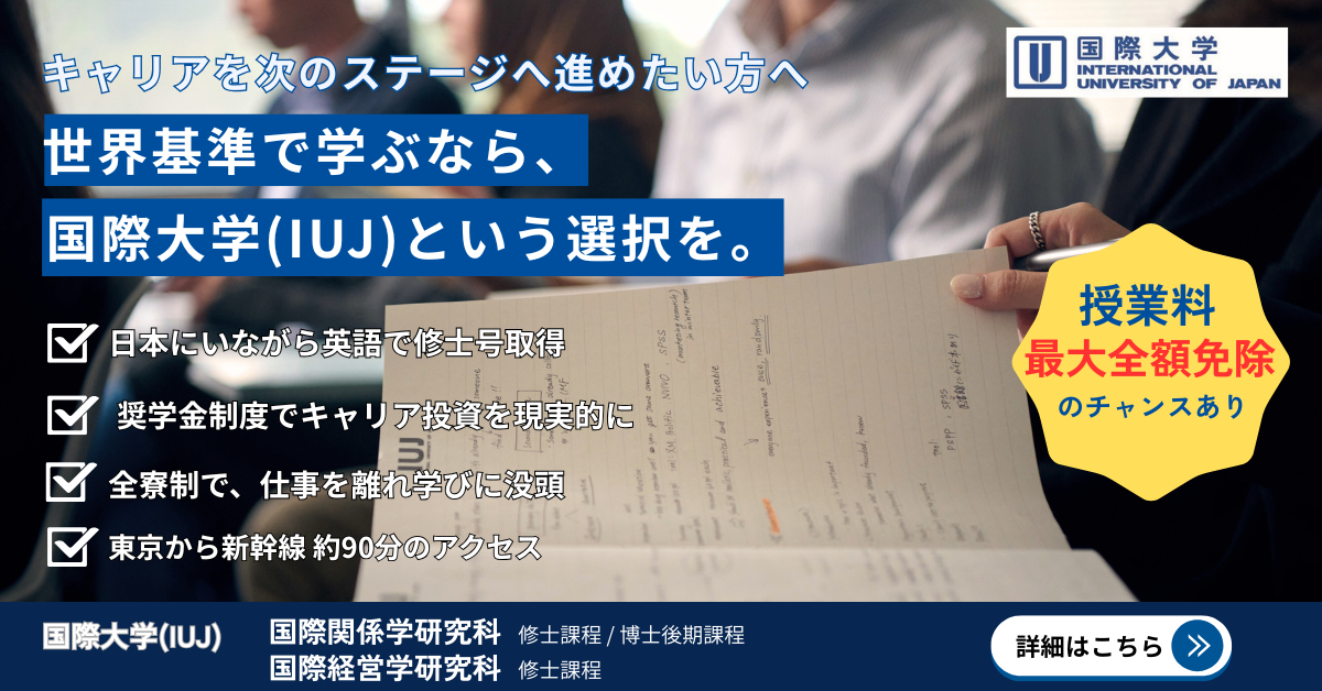 国際大学(IUJ)は、日本で初めて全授業を英語で行う大学院大学。60ヵ国以上の学生と学び、世界基準の経営を実践的に修得。各国政府や企業出身の学生との議論を通じ、現場で活きる経営視点を磨けます。日本にいながら英語でMBAを取得し、キャリアをさらに高めませんか?