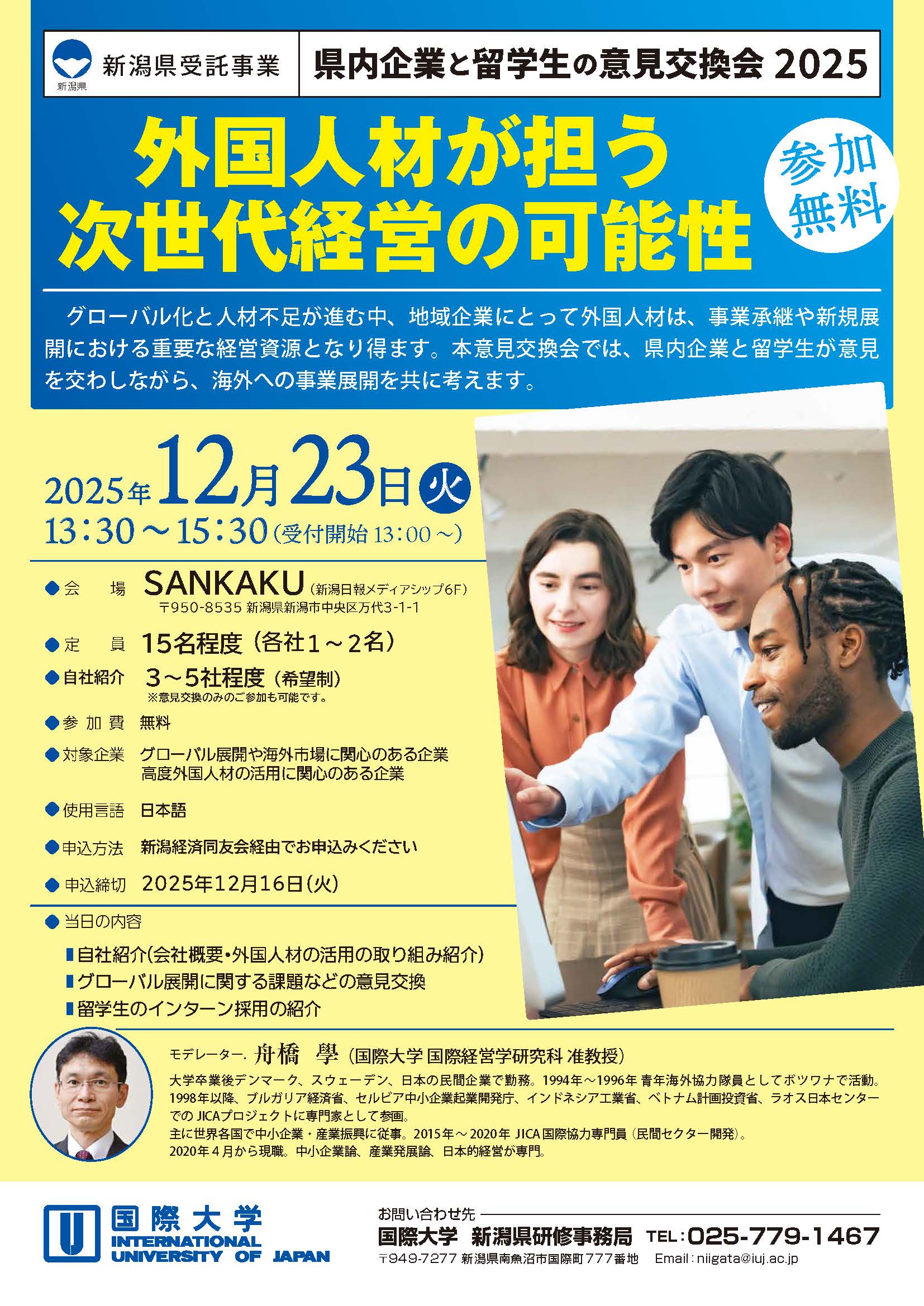 本意見交換会では、県内企業と留学生が意見を交わしながら、海外への事業展開を共に考えます。