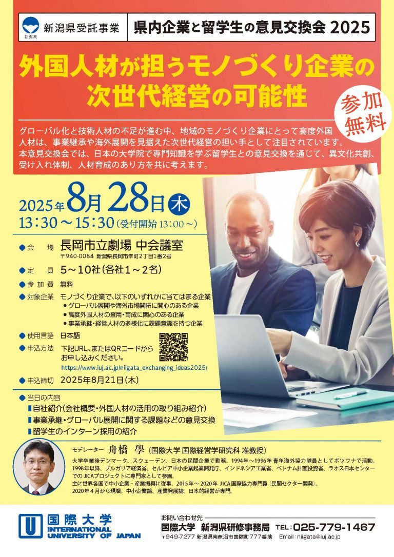 本意見交換では、外国人材が担う次世代経営の可能性 について、県内企業と国際大学の留学生(修士課程)が、異文化理解や受け入れ体制、人材育成のあり方を共に考えます。