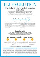 IUJ EVOLUTION In September 2014, the Ministry of Education, Culture, Sports, Science andTechnology (MEXT) selected IUJ for its Top Global University Project. From 109 applications led by 104 national, public, and private universities in Japan, MEXT selected 37 institutions. Building on what IUJ has already achieved, we will eagerly take up new challenges as a leader of Japan’s ongoing internationalization.Establishing a New Global Standardfrom AsiaTop Global University ProjectUniversities selected for the Top Global University ProjectThe Top Global University Project is a MEXT initiative to enhance the international compatibility and competitiveness of higher education in Japan by channeling support to universities of international stature or that are innovative. Amid ongoing economic globalization, the fostering of talented people capable of performing effectively in a global setting is indispensable for Japan’s continued prosperity. The universities selected for the Top Global University Project are taking initiatives based on their educational philosophies. These initiatives include stepped-up exchanges and collaboration with leading universities worldwide, refashioning administrative and management systems, and strengthening schemes for developing students’ global capabilities. Indicators and targets corresponding to these initiatives are set to track progress.Type B (Global Traction Type): 24 universitiesType A (Top Type): 13 universitiesHokkaido University, Tohoku University, University of Tsukuba, The University of Tokyo, Tokyo Medical and Dental University, Tokyo Institute of Technology, Nagoya University, Kyoto University, Osaka University, Hiroshima University, Kyushu University, Keio University, Waseda UniversityChiba University, Tokyo University of Foreign Studies, Tokyo University of the Arts, Nagaoka University of Technology, Kanazawa University, Toyohashi University of Technology, Kyoto Institute of Technology, Nara Institute of Science and Technology, Okayama University, Kumamoto University, Akita International University, The University of Aizu, International Christian University, Shibaura Institute of Technology, Sophia University, Toyo University, Hosei University, Meiji University, Rikkyo University, Soka University, International University of Japan, Ritsumeikan University, Kwansei Gakuin University, Ritsumeikan Asia Pacic UniversityFounding SpiritFoster leaders who not only possess high-caliber expertise and interdisciplinary perspectives but also are capable of applying what they know in a demanding international setting.The personal attributes IUJ aims to foster:1234People who strive to become leaders with capabilities that are a good fit with the needs of an increasingly globalized society People whose long-term perspective enables them to grasp the salient features of the changing world and who respect diversity globally and locallyPeople with the courage to take difficult decisions on pressing issues and the willpower to act effectively based on those decisionsPeople who can form constructive, durable relationships with counterparts from other fields throughout the world and collaborate with them for a better futureInternational University of Japan 4